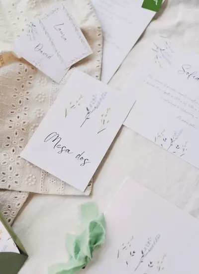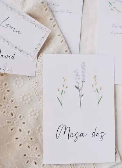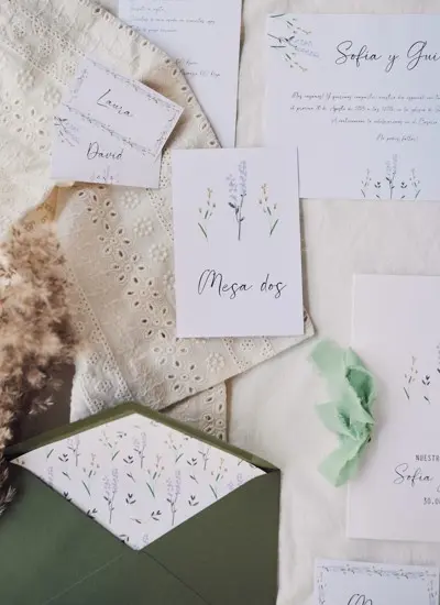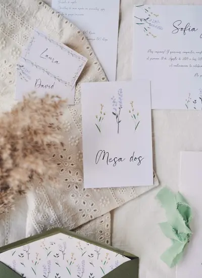 Un modelo que transmite serenidad y relajación, inspirado en los campos de lavanda. Los tonos morados y la delicada tipografía lo convierten en una opción perfecta para bodas con una atmósfera calmada y sofisticada.