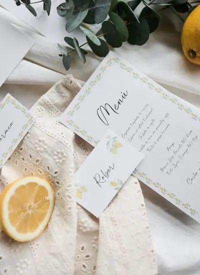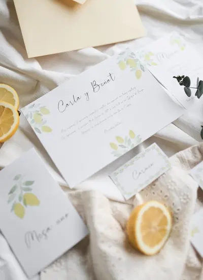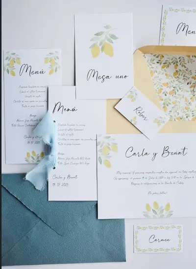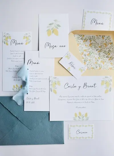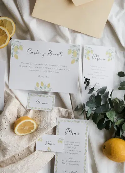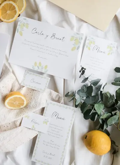Este modelo evoca la frescura y vitalidad de los limones, con ilustraciones sutiles que combinan tonos amarillos y verdes. Es perfecto para bodas veraniegas o eventos al aire libre que deseen un toque natural y alegre, sin perder la sofisticación que caracteriza a la línea clásica.