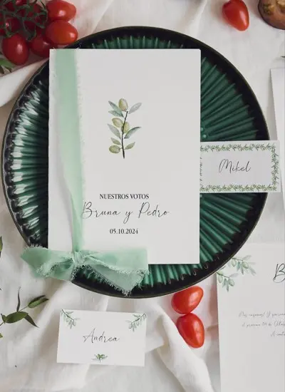 El olivo, símbolo de paz y prosperidad, se refleja en este diseño elegante, con ilustraciones finas y delicadas que evocan la tranquilidad de un paisaje mediterráneo. Es perfecto para bodas con temática rústica o de destino.